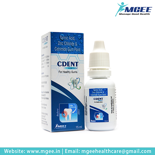 CDENT GUM PAINT is a specialized dental solution designed to provide relief from gum inflammation and promote oral health. This gum paint combines the astringent properties of Tannic Acid, the antiseptic qualities of Zinc Chloride, and the disinfectant action of Cetrimide. It is ideal for reducing gum swelling, bleeding, and discomfort associated with gingivitis and other periodontal conditions.