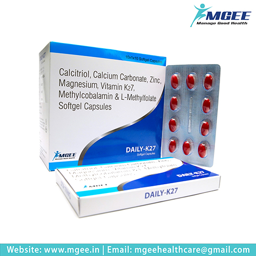 Daily K27 is a combination of seven medicines : Calcitriol, Calcium Carbonate, Zinc, Magnesium, Vitamin K2-7, Methylcobalamin, and L-Methyl Folate. Calcitriol is the active form of Vitamin D. It raises Vitamin D levels in your blood. This in turn raises calcium levels in your blood by helping you absorb more calcium from your intestine. Calcium carbonate is a dietary supplement used when the amount of calcium taken in the diet is not enough. Zinc is a nutritional supplement that provides essential nutrients to our body and improves overall health. Magnesium is an antacid that neutralizes the excessive acid in the stomach. Vitamin K2-7 plays a central role in the metabolism of calcium, the main mineral found in your bones and teeth. Vitamin K2-7 activates the calcium-binding actions of two proteins : matrix GLA protein and osteocalcin, which help to build and maintain bone health. Methylcobalamin is a form of vitamin B12 that restores its level in the body thereby helping in treating certain anemias and nerve problems. L-Methyl Folate is the primary biologically active isomer of folic acid and the primary form of folate in circulation. Folic Acid is a form of vitamin B. It plays a vital role in the formation of red blood cells, which carry oxygen throughout the body. It is also essential in pregnancy due to its role in the development of the unborn baby’s brain and spinal cord.