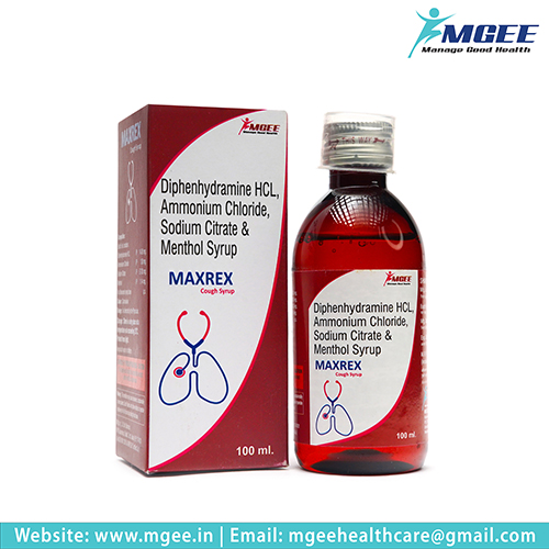 MAXREX is used to relieve symptoms of cough and cold. The 100 mL syrup includes Diphenhydramine Hydrochloride to reduce cough reflex, Terpine Hydrate to ease throat irritation, Ammonium Chloride to help thin mucus, and Sodium Citrate to balance pH levels. Take as directed based on your condition, and consult a healthcare provider if you have any health concerns or are managing other medications.