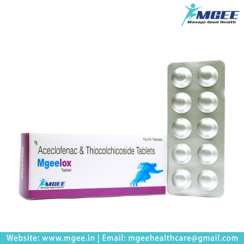 MGEELOX is a powerful combination medication that offers effective relief from pain and muscle spasms. Each tablet contains 100mg of Aceclofenac, a non-steroidal anti-inflammatory drug (NSAID) known for its pain-relieving and anti-inflammatory properties, and 4mg of Thiocolchicoside, a muscle relaxant that helps reduce muscle stiffness and improve mobility. This 10×10 Alu Alu pack is designed for convenient use, ensuring optimal protection and extended shelf life.